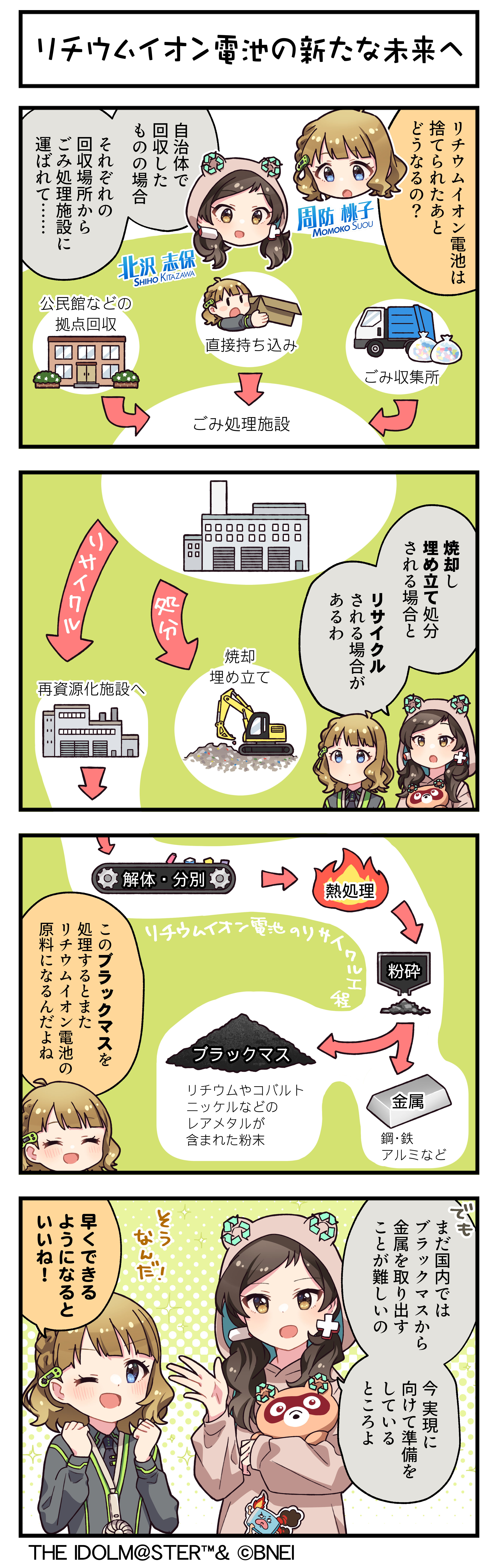 オリジナル衣装を着用した周防桃子さんと北沢志保さんの等身大パネルが登場。写真撮影も可能です。本ブースにご来場いただいた方には、特典として名刺風カードを2枚セットでプレゼント!(セット内容:周防桃子1枚・北沢志保1枚)●4コマ漫画でリチウムイオン電池を知ろう!