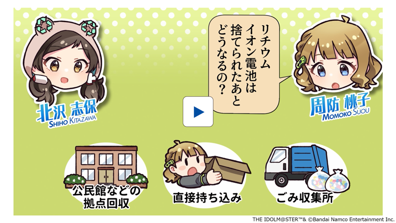 人気ゲームコンテンツ「アイドルマスター ミリオンライブ!」とのコラボ広報として「アイドルマスター ミリオンライブ!」のアイドルである周防桃子さんと北沢志保さんが環境省LiBパートナーとしてリチウムイオン電池による火災防止の周知啓発を実施します。●フォトスポット登場!